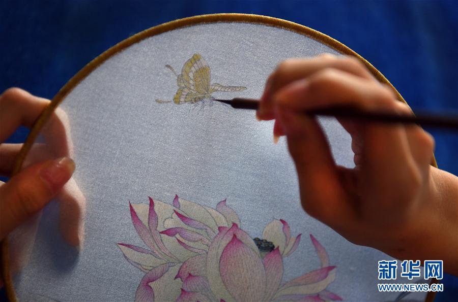 盛悅在精心創(chuàng)作工筆扇畫(7月25日攝)。新華社記者 陶明 攝