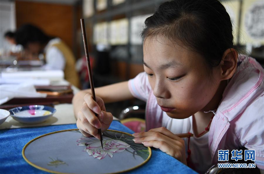 7月25日,盛悅在畫室學(xué)習(xí)班創(chuàng)作工筆扇畫。新華社記者 陶明 攝
