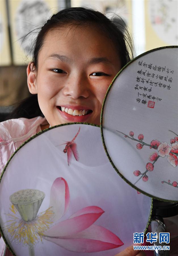 盛悅在展示她創(chuàng)作的工筆扇畫作品(7月25日攝)。新華社記者 陶明 攝