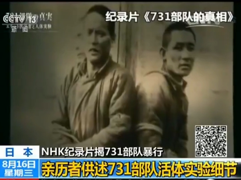 21日晚,日本NHK電視臺播出紀錄片《731部隊&mdash;&mdash;人體實驗是這樣展開的》,上下兩集共約110分鐘,詳細揭露了日本731部隊在中國東北地區秘密進行人體實驗 ... [更多詳細]