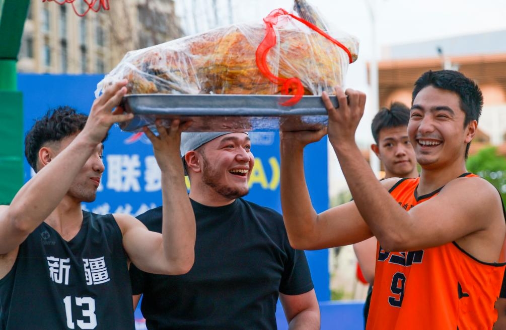 5月5日,101隊球員凱迪爾丁&middot;開熱曼(右)與隊友祖法爾&middot;瑪黑爾(中)、杰蘇爾&middot;瓦熱斯江展示冠軍獎品&mdash;&mdash;一只新鮮出爐的烤全羊 ... [更多詳細]
