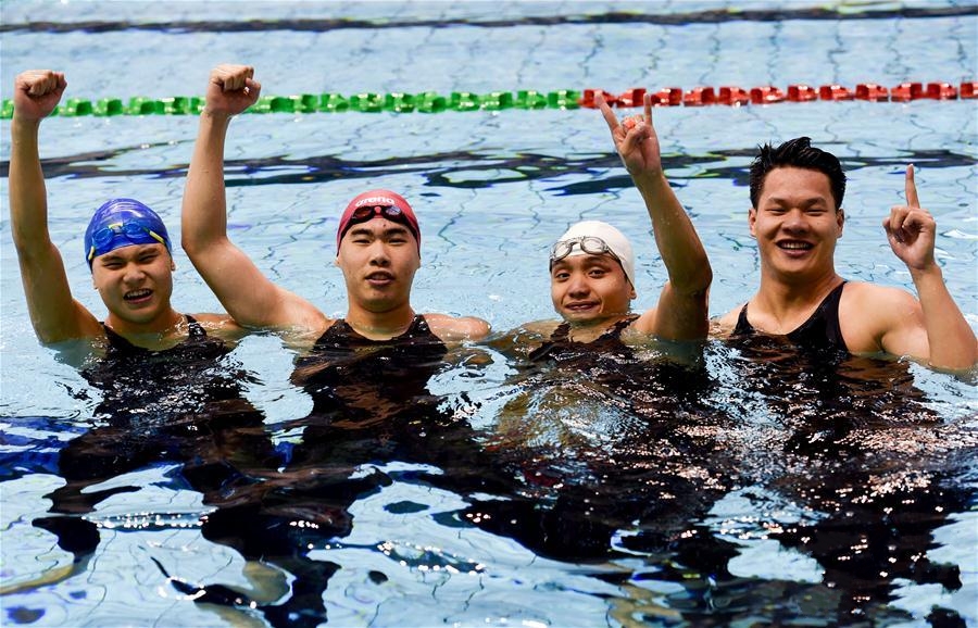 10月18日,遼寧隊選手在2018年全國蹼泳錦標賽男女4&times;100米雙蹼接力決賽頒獎儀式上展示金牌。他們以3分09秒61的成績奪得該項比賽冠軍。 10月18日,廣西隊選 ... [更多詳細]