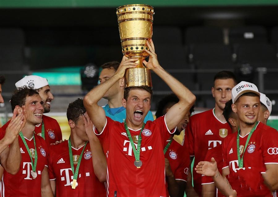 7月4日,拜仁慕尼黑隊隊長諾伊爾(中)在頒獎儀式上舉起冠軍獎杯。 當日,在柏林舉行的2019-2020賽季德國杯足球賽決賽中,拜仁慕尼黑隊以4比2戰勝勒沃庫森隊, ... [更多詳細]