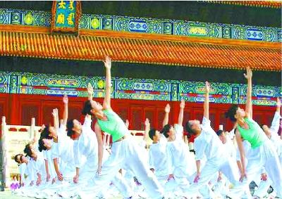 2010年,首都職工在勞動(dòng)人民文化宮太廟前廣場(chǎng)表演“新型”工間操