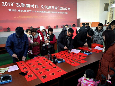 1月3日,浙江省書法家協會服務小分隊在杭州市蕭山區(qū)義橋鎮(zhèn)民豐村為農民寫福送春聯。2019年1月3日,浙江省2019文化進萬家活動在杭州市蕭山區(qū)義橋鎮(zhèn)民豐村拉開帷 ... [更多詳細]