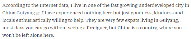 我住在一座發展很快的中國城市--貴陽。在這里,我充分體驗了美好、善意和當地居民樂于助人的熱情。這座城市是沒啥外國人,但中國就是一個你永遠不會覺得孤單無助的國家。
