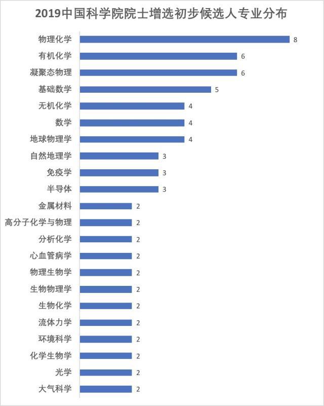記者梳理發現,候選人來自133個不同專業。其中,物理化學專業人數最多,為8人;有機化學專業和凝聚態物理專業其次,各6人;基礎數學專業第三,為5人。