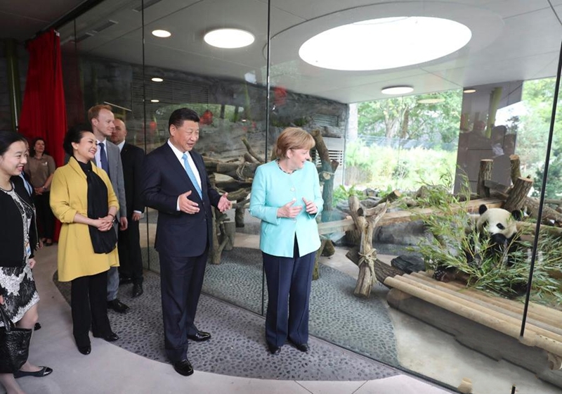 習近平和夫人彭麗媛抵達柏林動物園時,受到默克爾熱情迎接。習近平和彭麗媛同默克爾共同前往大熊貓館。沿途中國民樂樂聲悠揚,大紅燈籠高高懸掛。穿過具有中國特 ... [更多詳細]