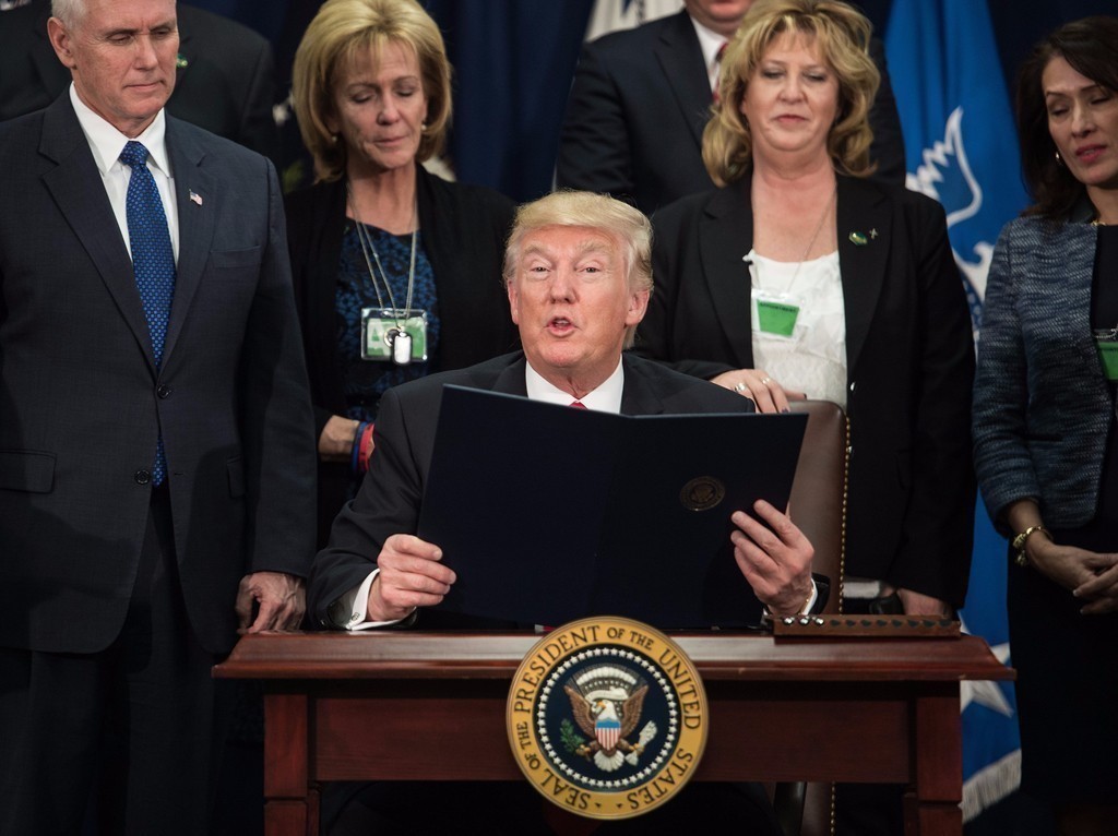 當(dāng)?shù)貢r(shí)間2017年1月25日,美國(guó)華盛頓,美國(guó)總統(tǒng)特朗普訪問(wèn)國(guó)土資源部期間簽署行政命令,正式下令在美墨邊境建隔離墻。