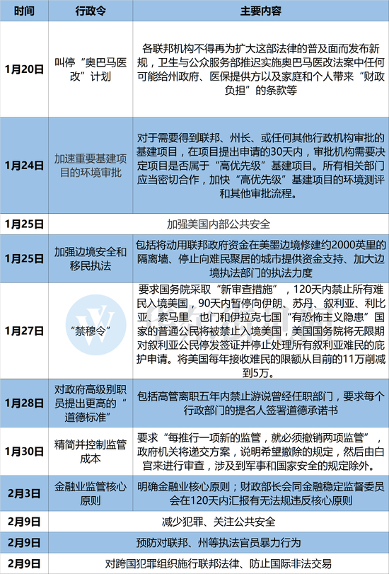 下圖為特朗普上任以來(lái)簽署的行政令一覽,由華爾街見(jiàn)聞?wù)怼?/p>