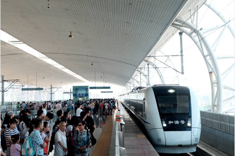 7月25日,成都,30多名市民從地鐵2號(hào)線下車通過成灌快鐵犀浦站的站臺(tái)交互換乘通道。他們用時(shí)不到3分鐘,完成了地鐵換乘動(dòng)車組的整個(gè)行程,快捷順利地坐上了開往都江堰的C6111次動(dòng)車。