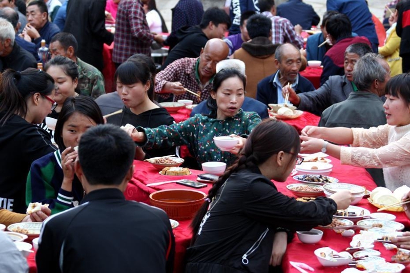 9月29日傍晚,國慶前夕,河南省盧氏縣新坪村張燈結彩,百余村民們圍坐于村委會門前的百草園廣場,他們拿出自家的拿手好菜,手工牛肉丸、熬炒柴雞、山水老豆腐、粉蒸紅薯葉、清炒香菇、清蒸南瓜等幾十樣的特色美食。聚在一起吃“百家宴”,話家長里短,擺放著美食的桌子圍成了巨大的“國慶”字樣,場面十分壯觀。