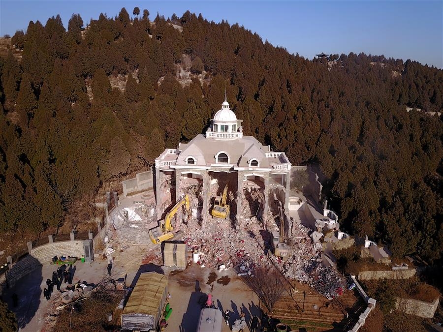 1月16日,執法人員對違建別墅進行拆除(無人機拍攝)。 日前,山東濟南金雞嶺別墅區中的一棟大面積違建別墅開始拆除。據了解,這棟豪華別墅建筑面積近2000平 ... [更多詳細]