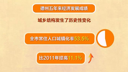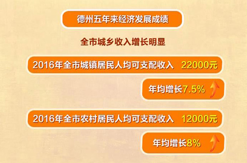 有這樣幾組數據,印證著德州五年來經濟發展的成績:2016年,德州的地區生產總值2945億元,五年來年平均增長9.9%。固定資產投資2529億元,年均增長17%;公共財政預算收入183.5億元,是2011年的1.9倍。區域經濟更加活躍,德州經濟技術開發區和高新技術產業開發區成功晉升國家級。經濟穩步發展,百姓的生活自然跟著越來越好,這五年,城鄉結構發生了歷史性變化,全市常住人口城鎮化率達到53.5%,比2011年提高11.1%。全市城鄉收入增長明顯。2016年,全市城鄉居民人均可支配收入分別達到22000元和12000元,年均增長7.5%和8%。