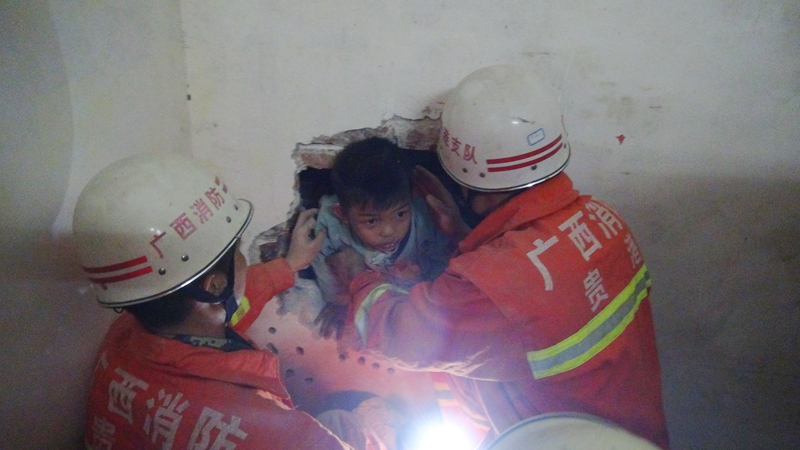 4月12日晚,在廣西桂平市中沙鎮中合村,一個6歲左右的小男孩由于貪玩鉆墻縫,結果被死死卡住,進退不得。后經當地消防官兵鑿墻營救,小男孩成功被救出。