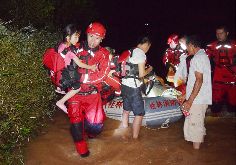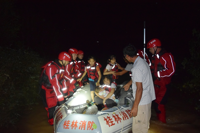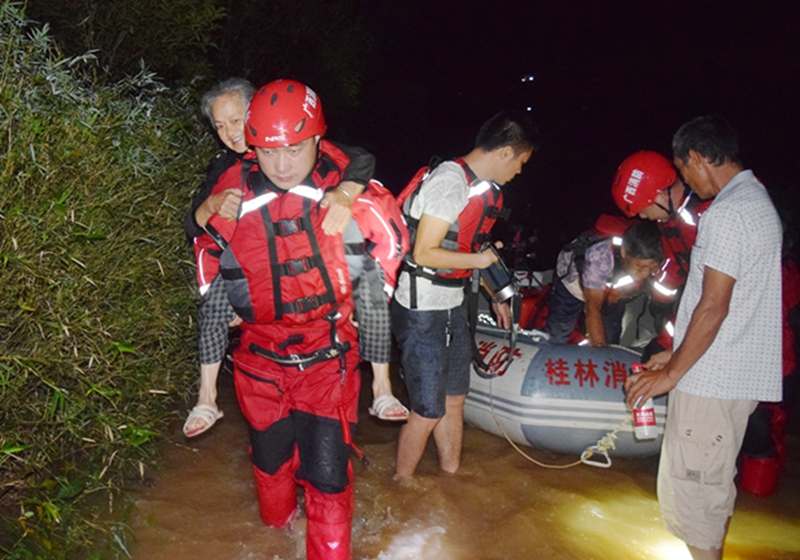 19時10分,救援官兵抵達雁山鎮,由于在廣西師范大學路段被暴漲的河水淹沒,官兵們只好攜帶裝備徒步前行。就在救援官兵整裝待發時,突然有個中年婦女前來求救:兒媳婦即將臨產,正趕時間前往陽朔縣醫院進行分娩,由于前方路段被河水淹沒,水流湍急無法通過。在得知情況緊急后,救援官兵立即為臨產婦女及攜帶的一名小孩穿上救生護送到安全地段。