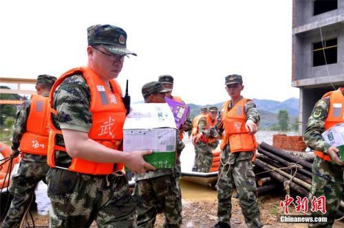 7月2日,武警黃石支隊官兵為湖北黃石市陽新縣富河水庫下游的龍港鎮星潭村受災民眾送去100件礦泉水和100箱方便面。 莊文偉 攝