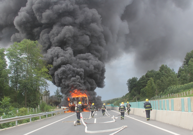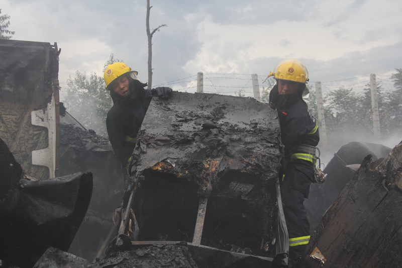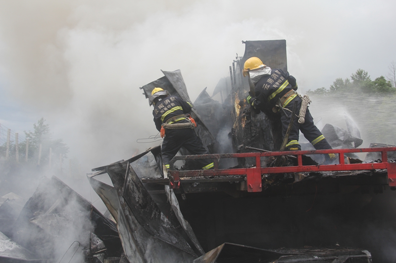 16時(shí)56分,救援官兵到達(dá)現(xiàn)場(chǎng)。此時(shí),先期到達(dá)的交警已經(jīng)對(duì)交通進(jìn)行了管制,指揮員經(jīng)過(guò)初步偵察,發(fā)現(xiàn)貨車(chē)上的火勢(shì)正處于猛烈燃燒階段,火苗飛舞,濃煙滾滾,熾熱的火焰使得塑料隔離帶已經(jīng)開(kāi)始塌陷變形,通紅的車(chē)體上不時(shí)發(fā)出一震刺耳的爆裂聲。大火正在向救援人員示威,烏黑的濃煙仿佛要吞噬一切。如不及時(shí)對(duì)火勢(shì)進(jìn)行壓制,后果將不堪設(shè)想。指揮員當(dāng)機(jī)立斷下達(dá)了作戰(zhàn)命令:安全員立即協(xié)助到場(chǎng)交警擴(kuò)大警戒范圍;救援一組鋪設(shè)一條水帶干線(xiàn)出兩支水槍對(duì)火勢(shì)進(jìn)行壓制,一支占領(lǐng)高速路旁的坡地,居高臨下,對(duì)大火發(fā)起猛烈攻擊。另一支水槍控制火勢(shì),阻止其蔓延。兩支水槍左右?jiàn)A擊,奈何堆放整齊的冰箱宛如給火焰穿上了一層鎧甲,局面陷入了僵持。據(jù)此,副中隊(duì)長(zhǎng)沈龍立即令救援二組在水槍的掩護(hù)下對(duì)燃燒貨物進(jìn)行清理。“快了...快了...”那一張張汗水蒸干后顯得通紅的臉龐上透著一股堅(jiān)毅。