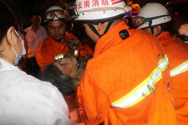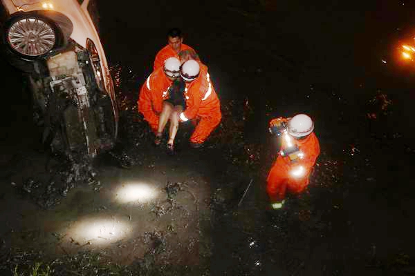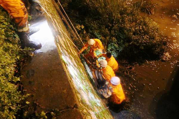 云南魯甸消防凌晨冒雨急救3名墜河轎車被困者