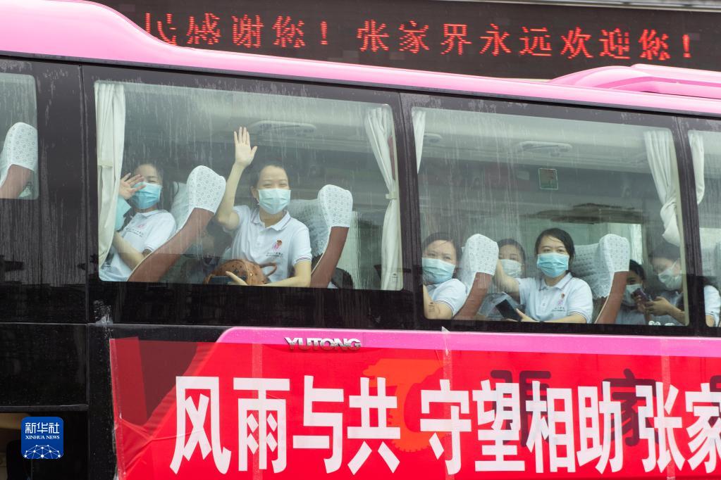 8月25日,在張家界市永定區(qū)政府門前,中南大學(xué)湘雅醫(yī)院抗疫醫(yī)療隊(duì)隊(duì)員向前來送別的人們比心。  8月25日8時(shí)起,張家界市全域均調(diào)整為低風(fēng)險(xiǎn)地區(qū),拆除所 ... [更多詳細(xì)]